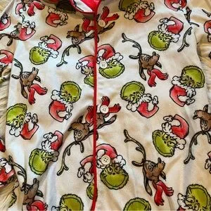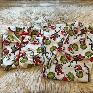 Adorable Grinch-themed pajama set. Features playful red, green, and white design. Ideal for cozy nights.