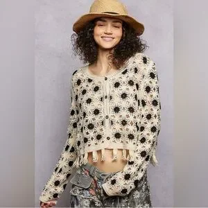POL crochet long sleeve top with fringe - ONE SIZE