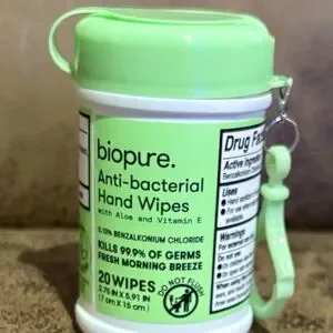 biopure anti-bacterial hand wipes in light green packaging. 20 wipes. Kills 99.9% of germs. Fresh Morning Breeze scent.