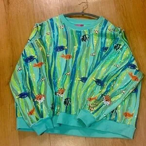 Vibrant aqua-green sweater with sequin sea life appliqués. Features multicolored fish and shimmering wave stripes. Soft crew neck and ribbed cuffs. Eye-catching and playful design.
