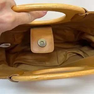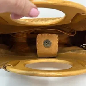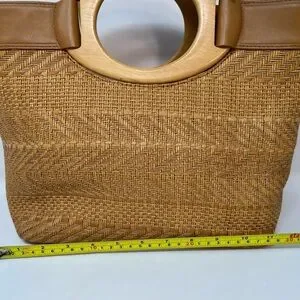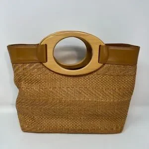 Fossil Handbag Wooven Straw Wood Handle Vintage Y2K Tan Aztec Like Pattern