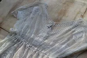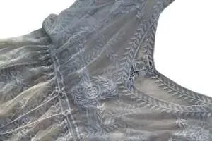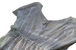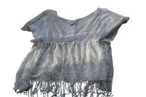 Rachel Zoe White Embroidered Mesh Tunic Swim Cover-Up, One Size — Boho Chic Beachwear. This stunning cover-up features intricate floral and leaf embroidery throughout a lightweight mesh fabric. It includes a cinched drawstring waist for an adjustable fit and a playful tassel fringe hem. Perfect for the beach, pool, or a resort vacation. Short sleeves and a flattering V-neckline. Excellent pre-owned condition with no stains or snags observed. Bohemian style with a designer touch.
