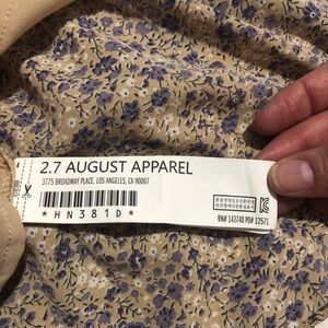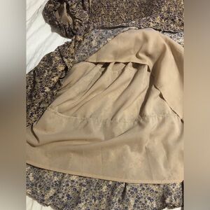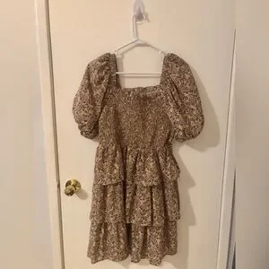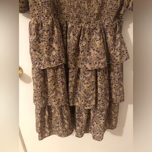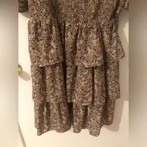 Super cute Free the Roses dress comes with a Smocked bodice with square neckline. Puff sleeves and tiered ruffle skirt. All-over small floral print in lavender on a beige background ground.