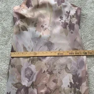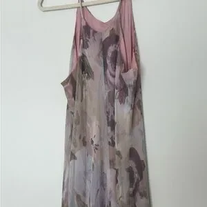 Full liken floral dress with high neck, flowy skirt, and chiffon like outer layer.