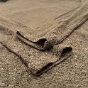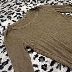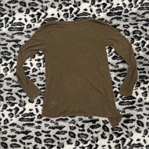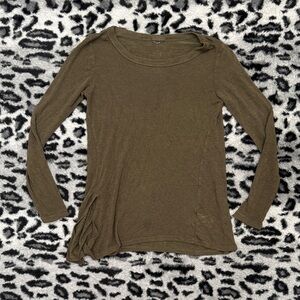Elevate your wardrobe with this stylish olive green long sleeve top, featuring a cute side slit asymmetrical look. Perfect for any occasion, it offers both comfort and elegance. Missing brand/size tag.