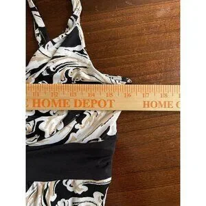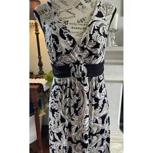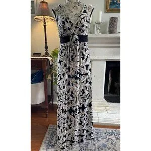 Chic maxi dress with a bold black and cream pattern. Sleeveless with a stylish belt accent. Ideal for versatile wear.
