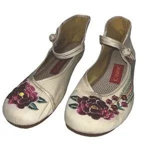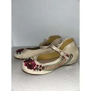 Cinak Cute Embroidered Mary Jane Textile Denim Comfort Beige Size 42. NWOB. Shipped with USPS Ground Advantage.