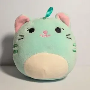 Adorable Squishmallows mint green cat plush. Features pink ears and a cream belly. Soft and cuddly. In like new condition.