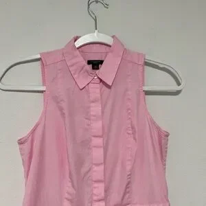 Chic pink dress with a collared neckline. Sleeveless design for a modern look. Perfect for versatile styling.