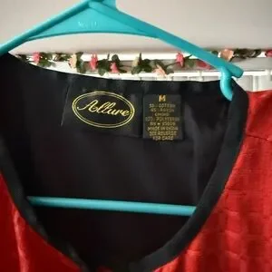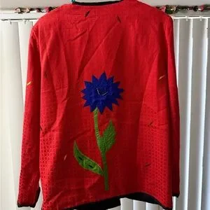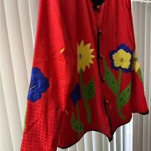 Bold red jacket with vibrant floral embroidery. Features colorful flowers and unique button design.