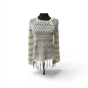 Gorgeous Free People open knit sweater in a soft cream color featuring a breathable crochet-style design with fringe hem detailing for that effortless boho vibe. Lightweight and airy, this piece is perfect for layering over tanks, bralettes, or swimwear.