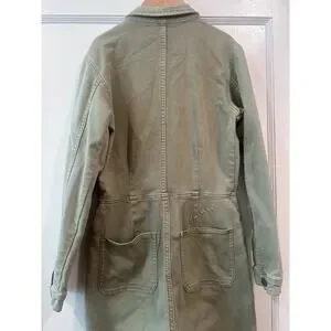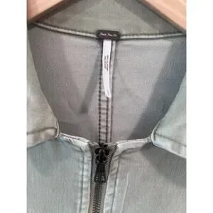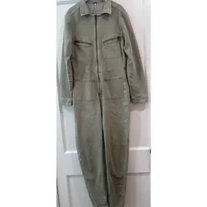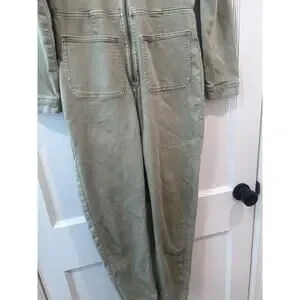 All flaws are shown close up in pictures.The Free People Lennox Denim Utility Jumpsuit in Army Green, size S, is a stylish and versatile piece perfect for travel or casual occasions. Made from breathable cotton denim, this jumpsuit features a V-neckline, long sleeves, and a 26-inch inseam. The belted waist and straight leg style offer a comfortable fit, while the solid green color and military-inspired theme add a trendy touch. With a zipper closure and button accents, this Free People jumpsuit is a fashionable and practical addition to any woman's wardrobe.
