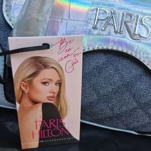 Elegant mini bag with iridescent blue accents. Comes with handles plus a crossover strap. Features a chic design and Paris Hilton branding. Ideal for a stylish look.