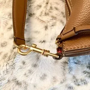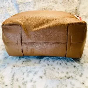 Rich “Moose” brown pebbled leather hobo bag with gold hardware and contrasting covered hanging logo. Top zipper closure and 1 interior slit pocket. Unlined.