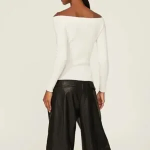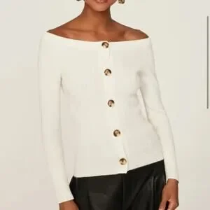 White knit (70% Wool, 30% Cashmere). Sweater. Long sleeves. Off the shoulder. Front button closure.