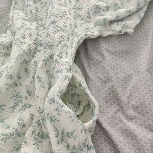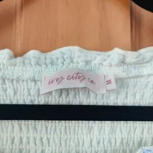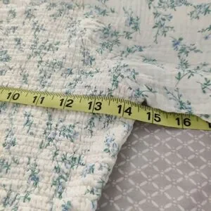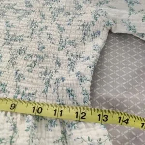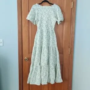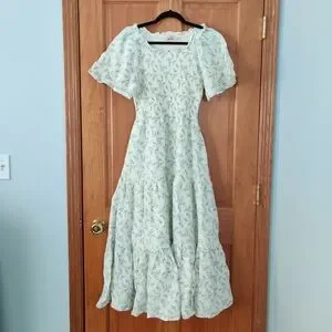 Soft pale blue floral maxi with short puff sleeves. Fitted bodice and flowing tiered skirt. Square neckline and feminine silhouette. Has side pockets.