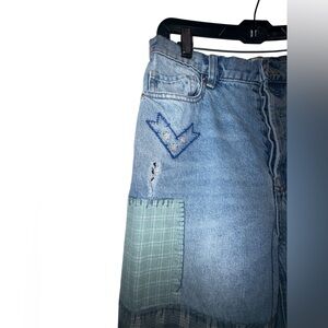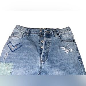 -Patchwork detail at front; distressing and floral embroidery at hip and vented hem