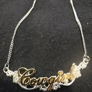 Two-tone pendant spells "Cowgirl" in script. Gold-tone lettering with silver-tone decorative accents. Feminine western style for layering. Durable adjustable chain for everyday wear.