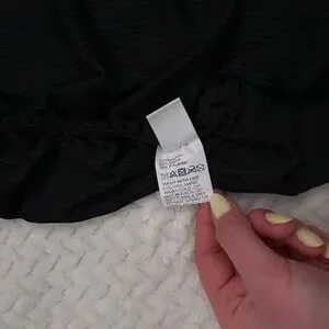 Sleek ribbed fabric with ruched sides. Fitted silhouette for a flattering look. Elastic waistband for easy wear. Versatile black design for day or night.