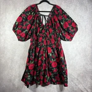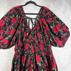 Old Navy Dress Women XXL Black Red Rose Puff Sleeve Smocked Waist Tie Back Boho