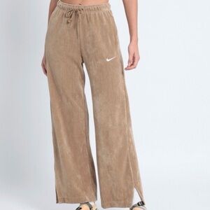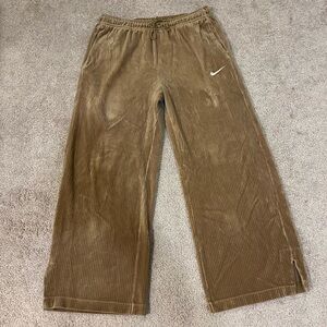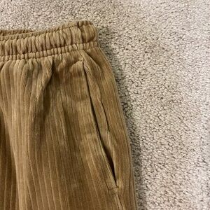 In good shape! Features “driftwood” tan/ brown color! Material is velour (velvet like feel, but with more stretch). Wide leg fit with pockets. 27 inch inseam! Perfect for any activity! Offers welcome!