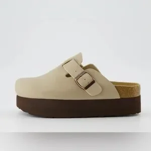 Stylish beige platform clogs with a brown sole. Features an adjustable strap for a secure fit.