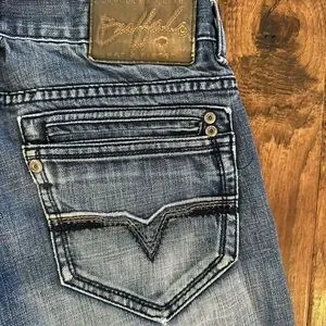 Light blue denim with faded wash and whisker detailing. and western vibe. Bootcut leg for balanced silhouette. Classic five-pocket styling and button fly. Versatile piece for casual looks.