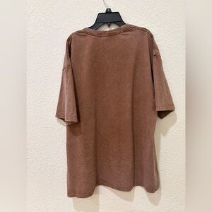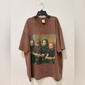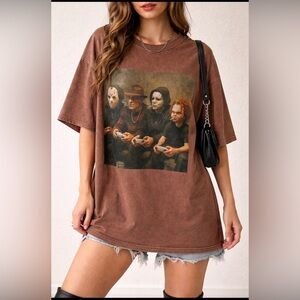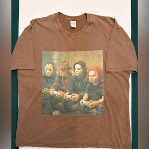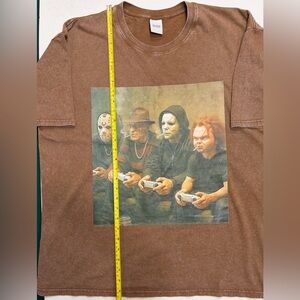 Graphic tee featuring four horror movie characters playing video games. Distressed brown wash. Soft cotton crew neck. Bold vintage-style print with rich tones.