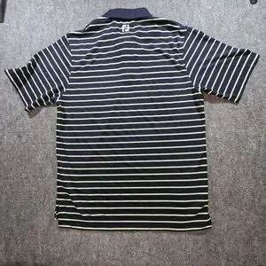 FootJoy navy and lime striped golf polo shirt in men's size Medium featuring lightweight performance fabric for comfort on the course. Clean striped design with embroidered BP logo on sleeve (see photos).