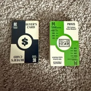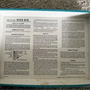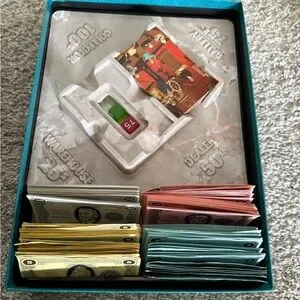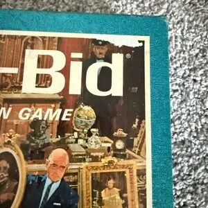 Excellent preowned, vintage item. Has all its pieces. The top right of the cover has a scratch. The game itself is in its own box that slides into the cover. The spine of the cover has a note taped on describing the game and a $3 price. I don't want to remove it because it could cause a tear. One of the $10 bills has a tear in the top left, but it still shows the number. See photo. I'm being as specific as possible because this is a vintage, preowned item. Great for board game collectors and mid-century modern enthusiasts.