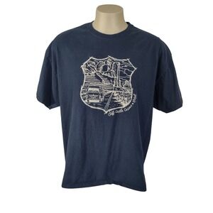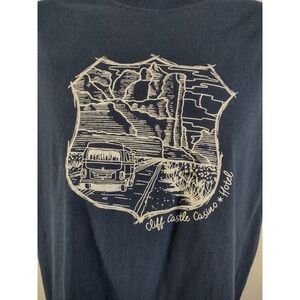 MV Sport T-Shirt Men XXL Graphic Tee Y2K VTG Navy Blue Cliff Castle Casino Hotel Style 207. This classic fit short sleeve tee features a screen-printed graphic on the front depicting a scenic road trip view within a shield border, advertising the Cliff Castle Casino & Hotel. Crafted from 100% cotton for a comfortable feel, it includes a ribbed crew neckline and double-stitched hems.