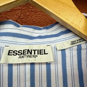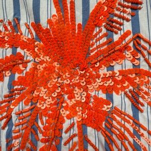 Essential Antwerp long-sleeve button-down in blue and white vertical stripes. Features bold red palm tree sequens across the chest for a tropical accent. Classic collar and full button front for easy styling. Lightweight woven fabric that layers well for casual or resort looks.
