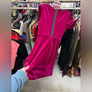 Chic velvet dress with short sleeves. Vibrant pink color. Perfect for any occasion.