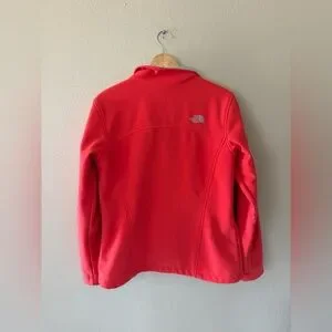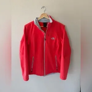 Stay warm and protected in this The North Face Apex Bionic soft shell jacket in a beautiful deep coral pink color (appears more pink in person than in photos). This fleece-lined jacket is perfect for everyday wear, outdoor activities, and cooler weather with its wind-resistant soft shell and comfortable fit.