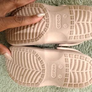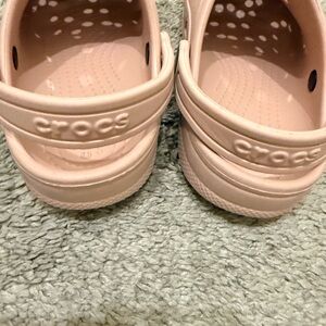 Light pink kids' clogs with ventilation holes. Slip-on design with pivoting heel strap. Soft Croslite foam for cushioned wear. Fun flower and pearl charms for playful detail.MO REFUNDS IR EXCHANGES. PLEASE REVIEW PICTURES