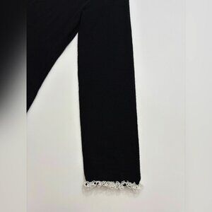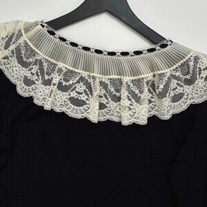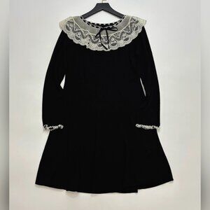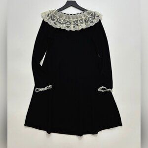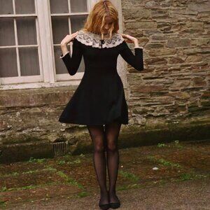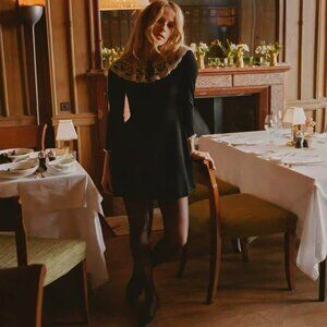 The DOEN Sandrine Dress is crafted from softly ribbed 100% merino wool in a mini silhouette. It features full-length sleeves and a swingy skirt with godets at the hem adding movement. A Victorian-inspired collared neckline and cuffs in lace and organza, threaded with grosgrain ribbon, lend a touch of romance.