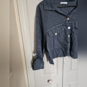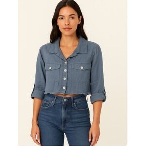 weather and layering. The cropped cut and raw hem add a trendy, modern edge, while the button-front design and dual chest pockets give it a casual-chic look.