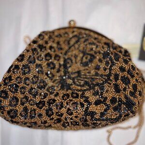 Beautiful handmade-style beaded clutch featuring a bold cheetah/leopard print design in black and gold. This statement piece is fully embellished with intricate beadwork, giving it a luxe vintage-inspired look perfect for evenings, events, or special occasions.