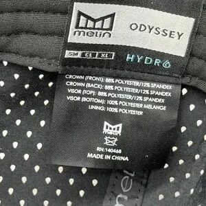 Branding and labels: Front molded rubber Melin logo patch; left side rubber Melin badge and droplet emblem; interior seam taping with repeated Melin branding; woven interior label lists Melin Odyssey HYDROG; interior tag lists fabric content, RN 140468, and Made in China; turquoise Designed in California ribbon at center back.