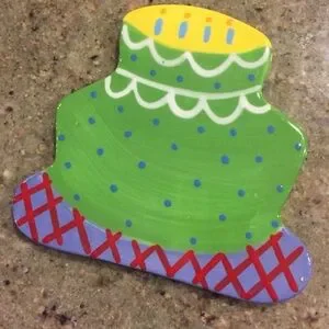 Vibrant ceramic ornament shaped like a sweater. Features green, yellow, blue, red, and purple colors. Perfect for festive decor.