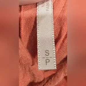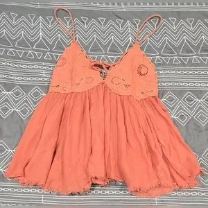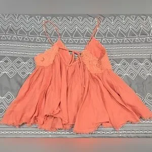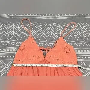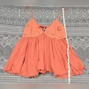 Great condition. Size small. A peachy orange color. Gauzy material on bottom and lace on top. Spaghetti straps that can be adjusted on the back. On tie the bow and lengthen the straps. Flowy. Measurements and fabric content listed above in pictures.