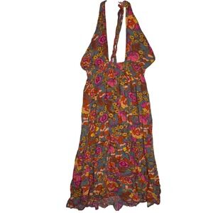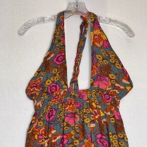 Boho Floral Halter Maxi Dress Smocked Bodice Tie Neck Flowy Vacation Resort