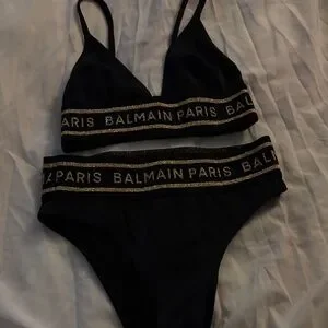 Two-piece Balmain intimates set. Soft bralette with branded elastic band. Matching high-waist brief with gold logo detailing. Sleek black fabric with metallic accents for a luxe look.