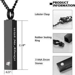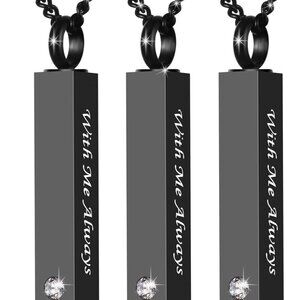 Memorial Ashes Necklace: Keep your loved one close to your heart forever. This stainless steel pendant can hold ashes, a lock of hair, or dried flowers, making it a meaningful keepsake. The vertical bar design features the words "With Me Always" and a sparkling cubic zirconia, adding a touch of elegance.