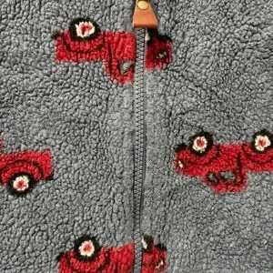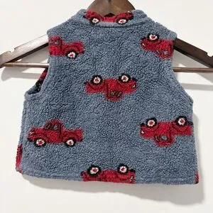 This Hartstrings vest features a playful design with red toy trucks scattered across a soft blue fleece fabric. The sleeveless, zip-up style makes it perfect for layering, providing both warmth and a touch of fun to any outfit.