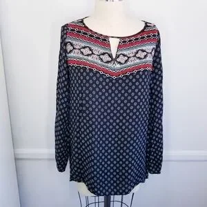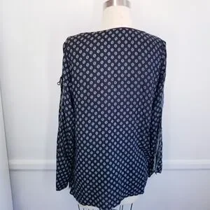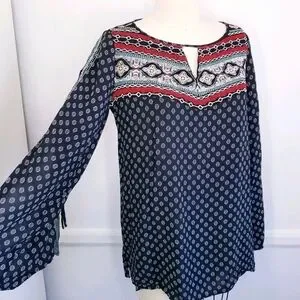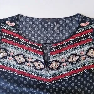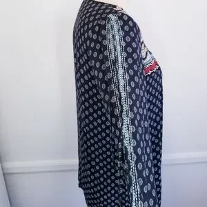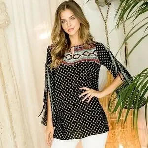 Long sleeve hand embroidered tunic top with cold shoulder sleeves that have tie detail.