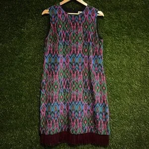 From the closet of my elegant MIL comes this Missoni silk shift dress with a fun tassel hem! Size and material/care tags have been cut out, calling this a general size Medium, measurements are below: