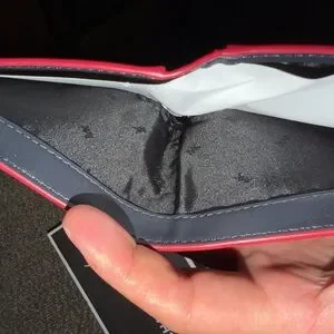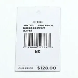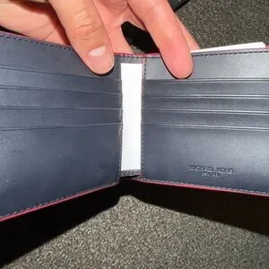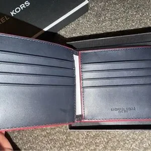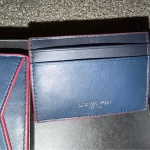 This is a brand new Michael Kors men's wallet and card holder set, presented in its original black gift box. Please note the original gift box itself is damaged, wallet is not. The set features a stylish bi-fold wallet and a matching card holder, both crafted from navy blue pebbled leather with a distinctive red trim. The Michael Kors logo, "EST. 1981", is embossed in silver on both pieces. The wallet is in excellent condition and the card holder has some slight warping. Both items in set are unused and brand new.