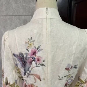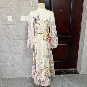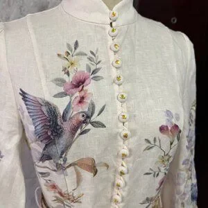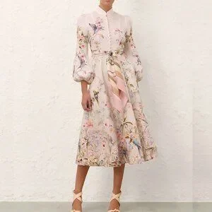 The Rebellion Button Midi Dress in Cream Aviary from our Cruise 2026 Collection, Twisted Romance. A linen midi dress featuring long blouson sleeves with elasticated cuffs, functional front buttons, finished with a removable scarf belt.