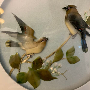 This vintage, framed 3D art features two birds, a branch, and flowers crafted from carved shell. The sculptures are set against a light blue background, framed by a white mat and a light brown wooden frame with a beaded inner edge. The frame measures approximately 15 inches wide by 39cm tall (square) and is about 1.5. inches deep. The birds display brown, cream, and dark accents. Minor wear consistent with its pre-owned condition may be present. Handmade.